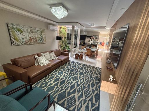 🛋️ Sala em 2 ambientes com painel de TV, cortinas e luminárias